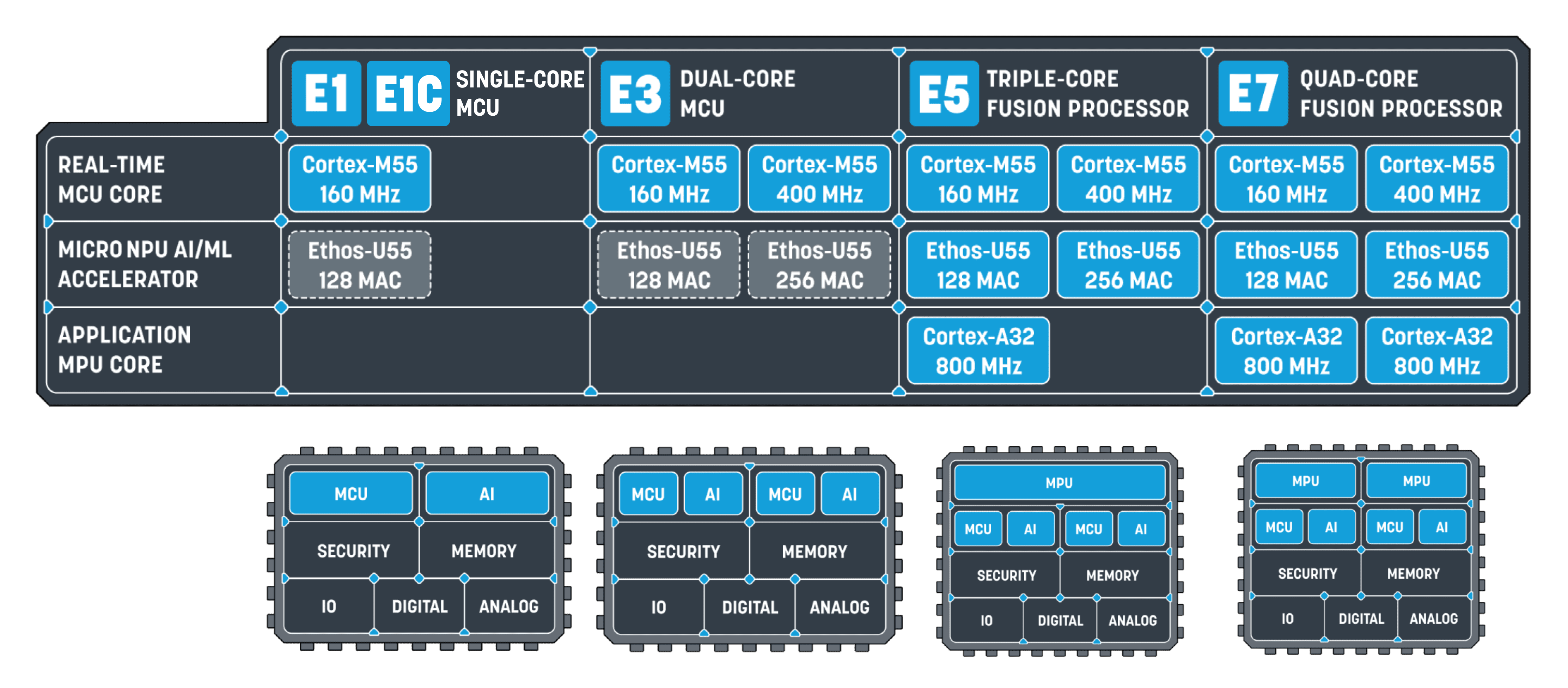 Alif Semi Ensemble series offer great flexibility with its multiple Arm Cores and Arm NPUs. Plus, it is all footprint compatible reducing cost and saves time.