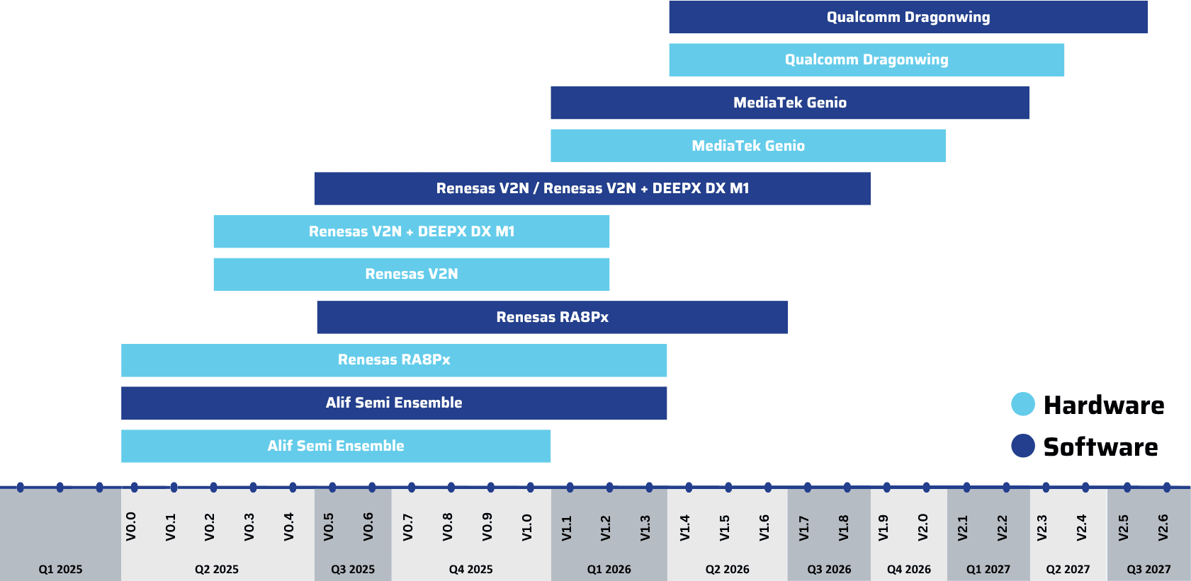 Our first integration started with Alif Semi Ensemble MCUs. We have the following MCU/MPUs in our plan.